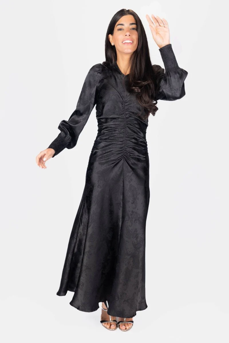 This elegant black midi dress exudes timeless sophistication with its tailored silhouette and delicate details. Featuring a subtle jacquard pattern, this dress adds depth and texture to the rich black fabric. The ruched bodice enhances the fit, creating a flattering shape, while the long sleeves with fitted cuffs bring a refined touch. Flowing gracefully into an A-line skirt, this dress is perfect for both day and evening occasions. Whether paired with heels for a chic event or styled casually, this versatile piece is a wardrobe must-have.