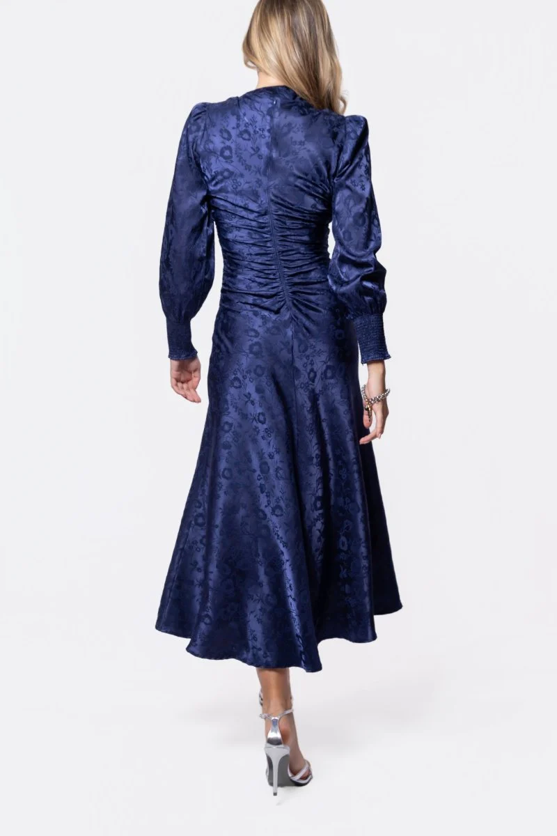 Timeless and refined, this Audrey Dress is the perfect blend of elegance and versatility. Crafted with a subtle jacquard floral pattern, it offers just the right amount of texture and depth while keeping a polished look.The design features a flattering V-neckline, ruched detailing at the waist for a slimming effect, and long sleeves that balance out the silhouette. The flowy midi-length skirt adds graceful movement, making this dress an ideal choice for both daytime sophistication and evening chic.
