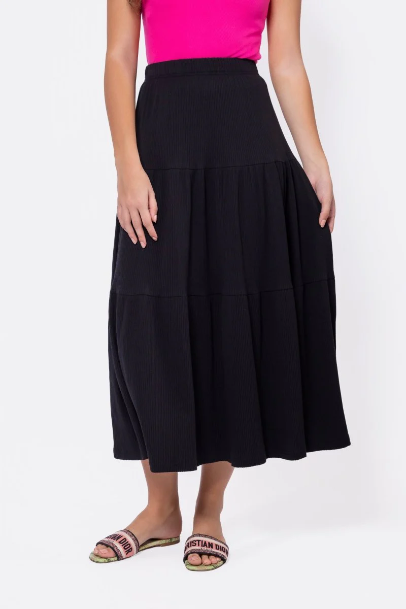 This black tiered maxi skirt is the perfect mix of comfort and style. Made from a soft, lightweight fabric with subtle texture, it features a flattering elastic waistband and tiered silhouette that moves with ease. Whether you pair it with a tee or a dressy blouse, it’s a versatile piece you'll reach for all year long.