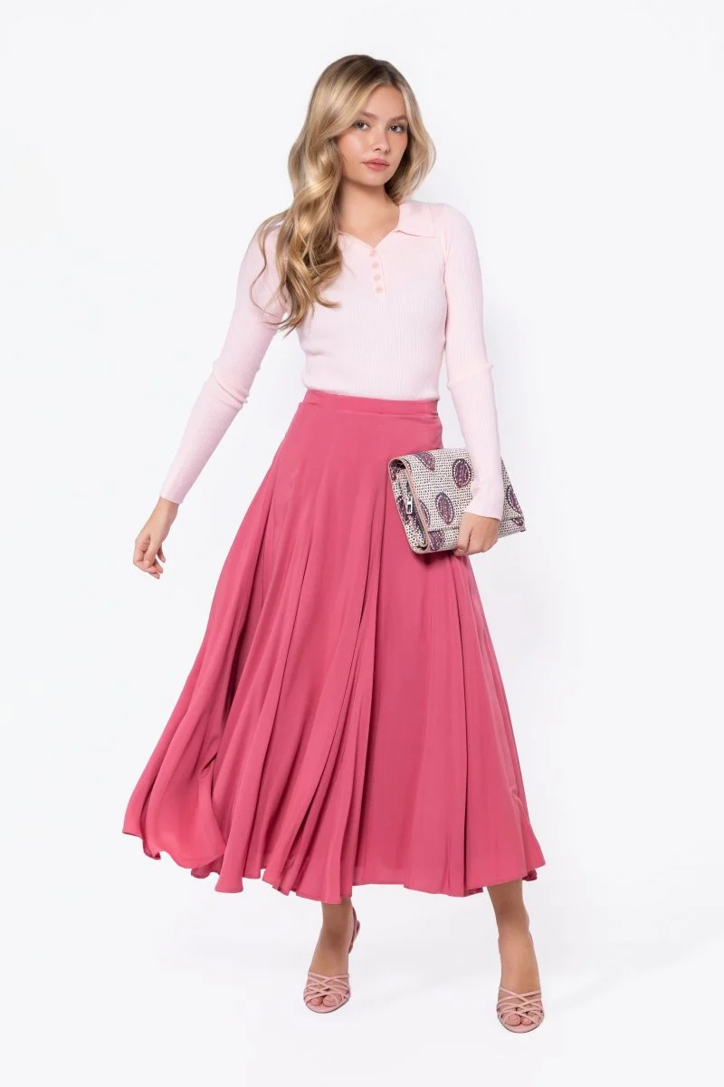 This is a chic and timeless long-sleeve knit top in a pink soft pastel hue. It features a flattering ribbed texture, a classic collared neckline, and a button-up placket for added detail. The fitted silhouette makes it a versatile piece that can be effortlessly paired with skirts, perfect for both casual and semi-formal occasions.