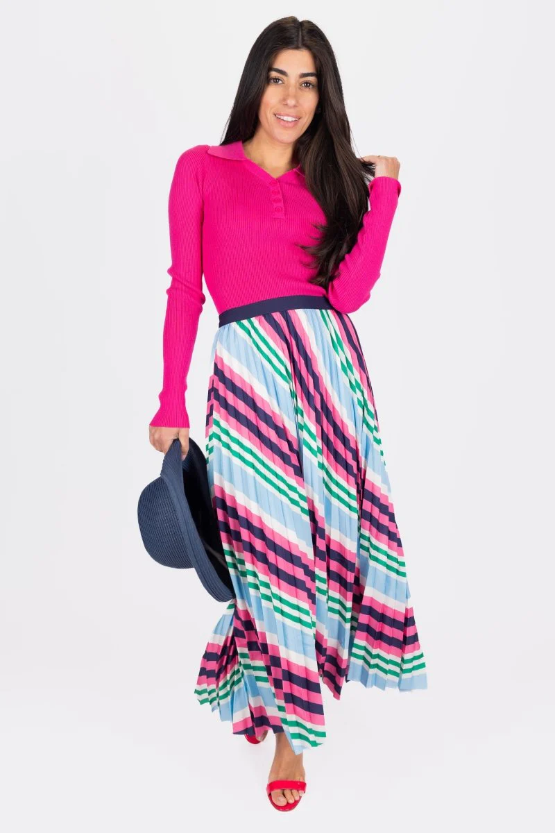 This is a vibrant and elegant long-sleeve top in a bold magenta hue. It features a ribbed texture, a chic collared neckline, and a buttoned placket for a polished look. The fitted silhouette ensures a flattering and comfortable fit, making it perfect for pairing with skirts. A versatile piece, this top can be dressed up or down for any occasion.