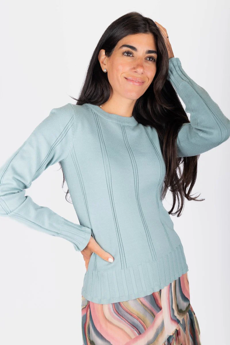 The Claire is our elegant sweater top. The carefully designed vertical ribbed knit creates a unique look that has not been seen anywhere else! This sweater comes in a soft denim blue. Check out out the comfortable high neckline and fitted sleeve cuffs