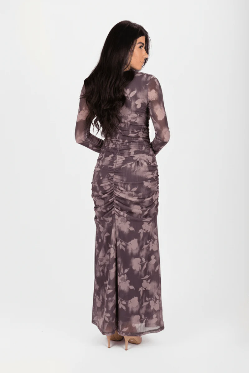 Turn heads effortlessly in this stunning floral midi dress, designed to flatter every curve. Featuring a soft, brushed floral print in romantic tones, this dress combines elegance with comfort. The statement ruched detailing along the front creates a beautifully sculpted silhouette, while the long sleeves add a touch of sophistication.