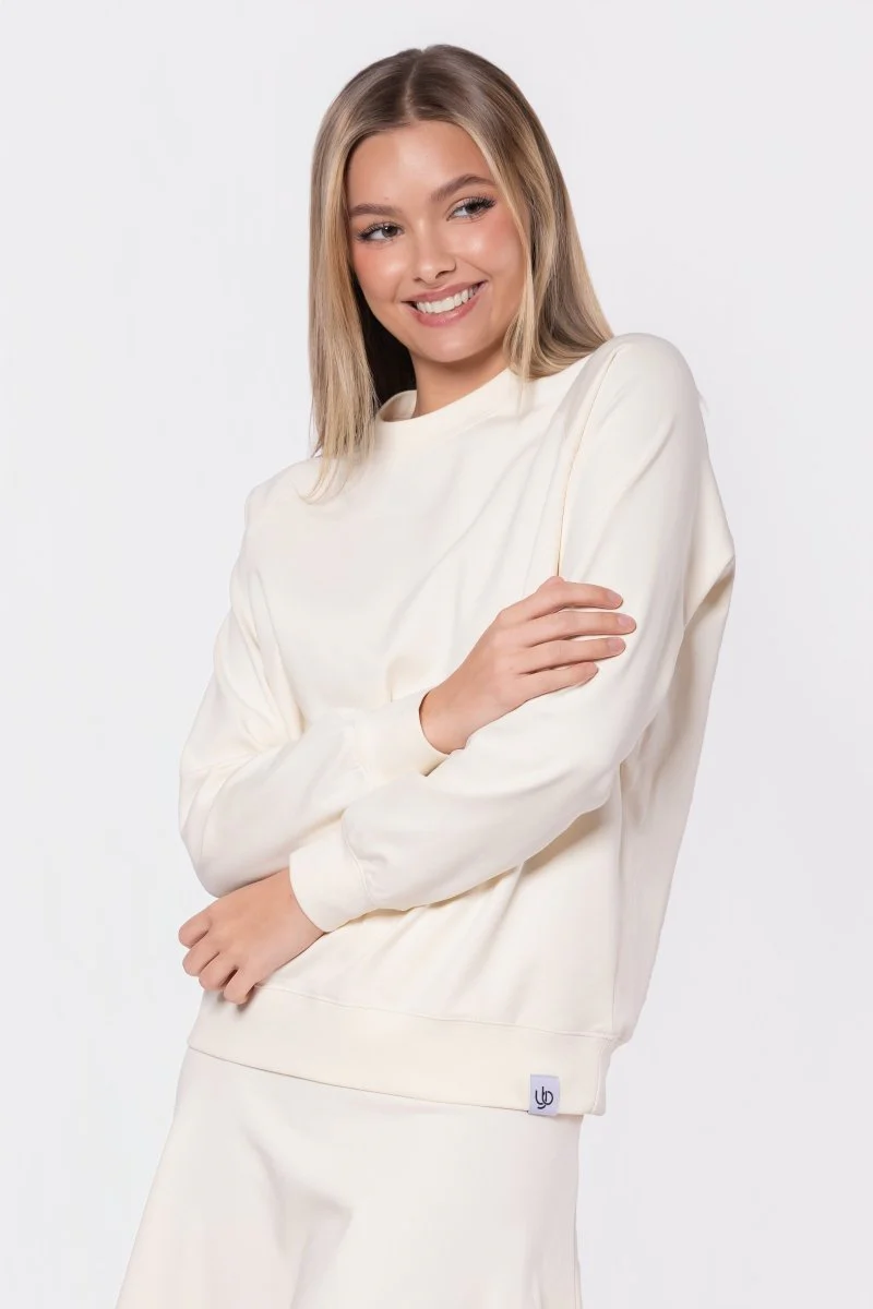 Cozy, clean, and effortlessly chic—this ivory pullover sweatshirt is a must-have for everyday comfort. Made from ultra-soft fabric with a relaxed fit, it features classic ribbed cuffs and hem for a polished finish. Perfect for pairing with our Karla Skirt, it’s the ultimate layering piece that blends style and softness in one timeless silhouette.