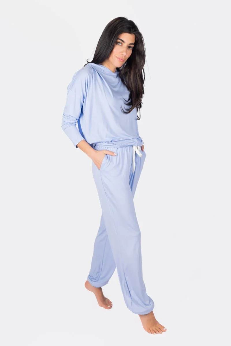 Effortlessly chic and ultra-comfy, this light blue pajama set is your new go-to for lounging in style. Featuring a relaxed-fit long-sleeve top and soft, flowy pants with a drawstring waist, it’s designed for ultimate comfort while keeping you looking effortlessly put together. Perfect for cozy nights in, lazy mornings, or simply unwinding in elegance. Comfort meets sophistication in this must-have loungewear essential!