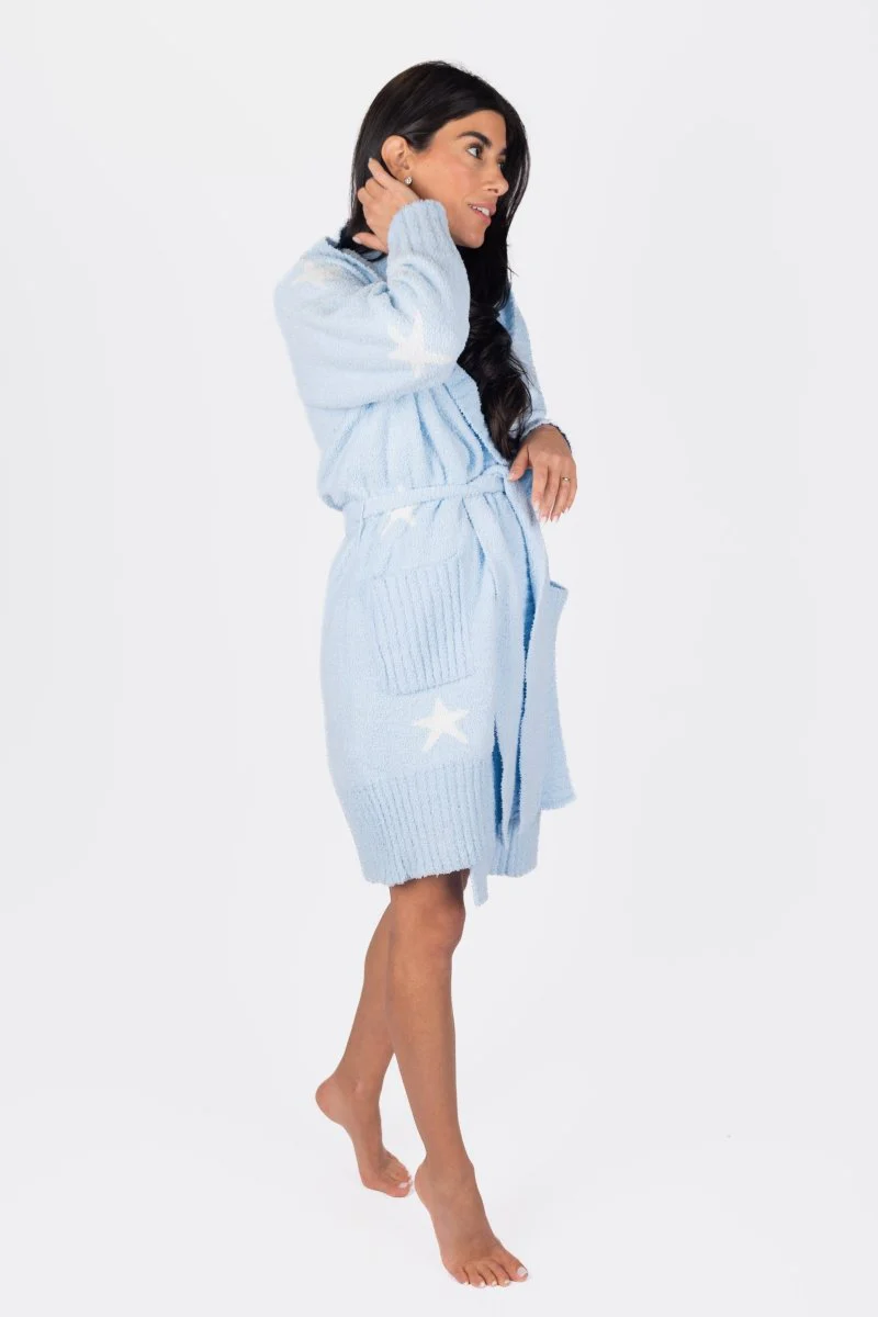 Wrap yourself in pure comfort with this dreamy, plush robe. Designed in a soft pastel blue with delicate star details, it features a relaxed fit, cozy front pockets, and a tie-waist for the perfect snug feel. Whether you're lounging at home or indulging in a self-care day, this robe is your go-to for effortless warmth and style. Soft, cozy, and oh-so-chic!