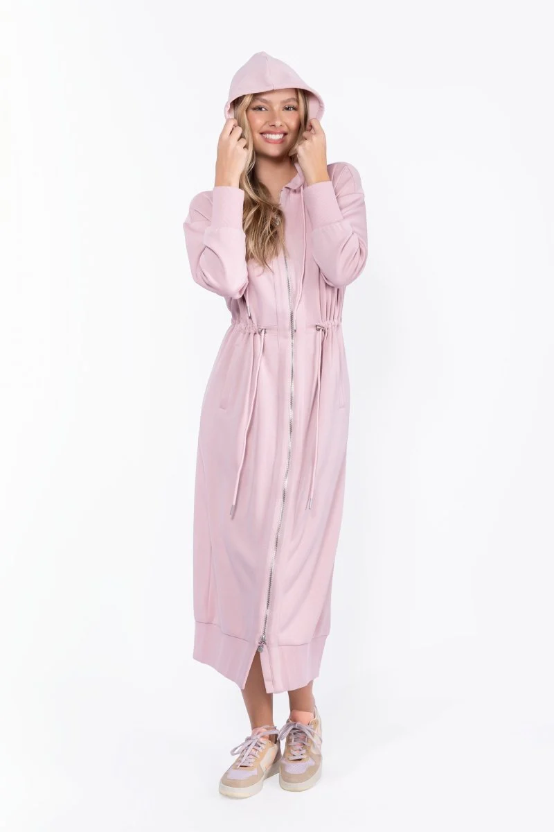 The Mina is the ultimate everyday essential, seamlessly blending the comfort of your favorite sweatshirt with a polished, feminine silhouette. Designed for life on the go, it features a full-zip front and a built-in hood that provide a modern, athletic edge. The functional drawstring waist allows you to transition from a relaxed fit to a more defined shape in seconds, while the practical side pockets and cozy ribbed cuffs ensure all-day utility.