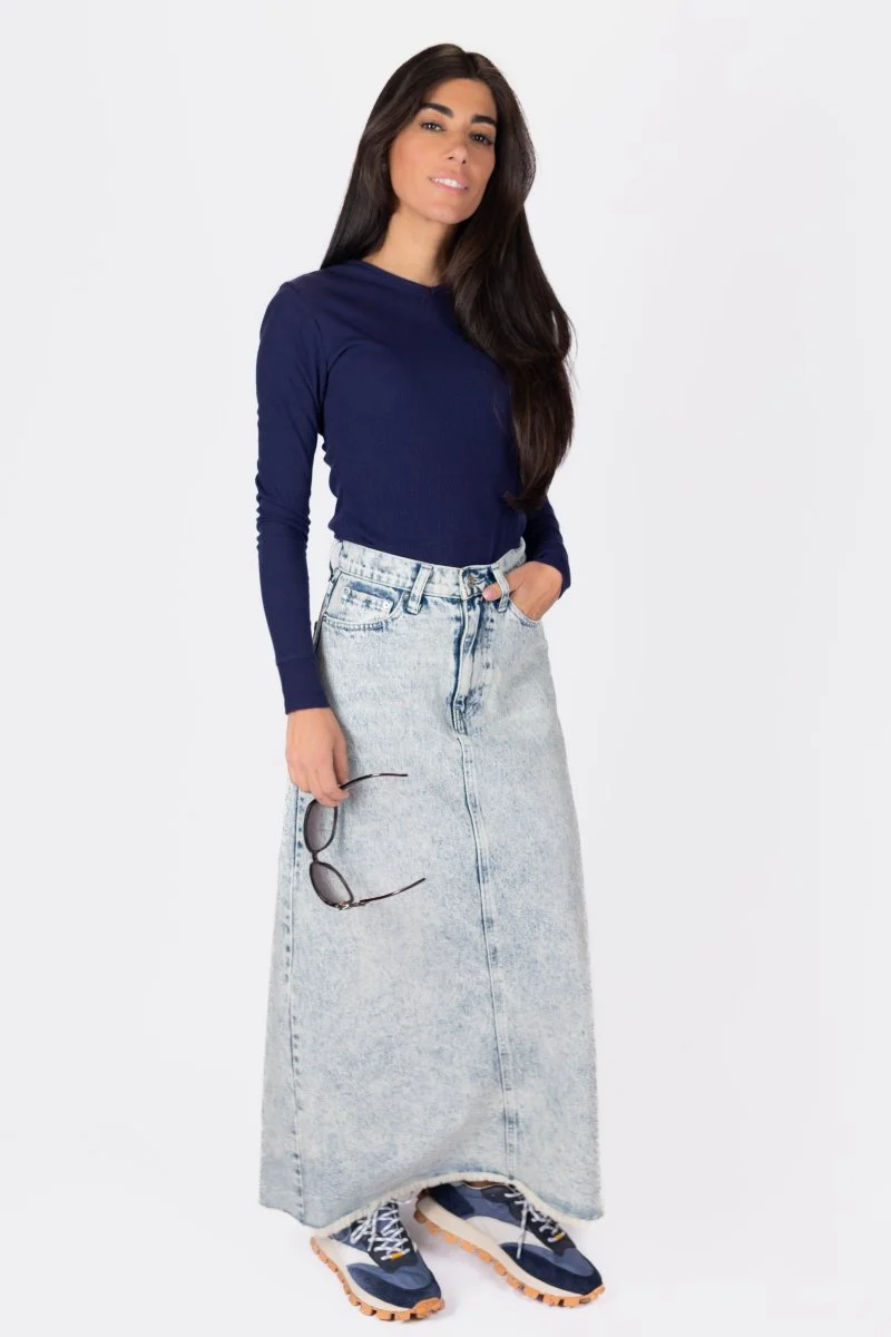 Designed in a super soft, stretchy ribbed knit, it hugs your figure just right while the classic crew neckline keeps it timeless. The navy hue adds a confident pop to both casual and elevated looks — perfect for pairing with neutrals, prints, or denim.