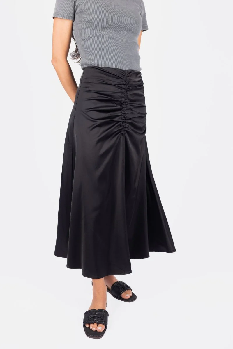 This sleek black satin skirt exudes effortless elegance with its ruched detailing at the waist, creating a flattering and feminine silhouette. The smooth, flowing fabric drapes beautifully, making it a versatile staple that can be dressed up or down. Perfect for an evening out or a chic daytime look, this skirt pairs well with both fitted tops and oversized knits.